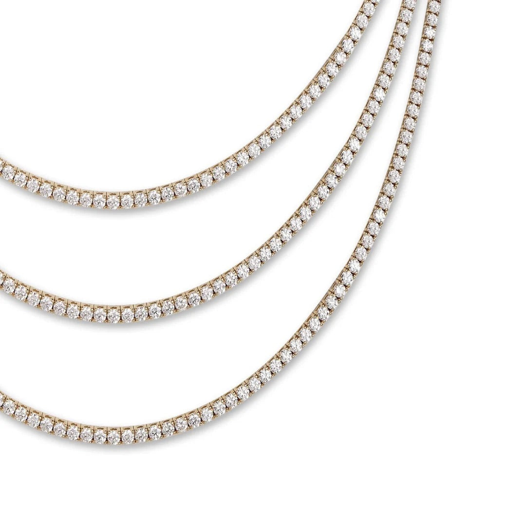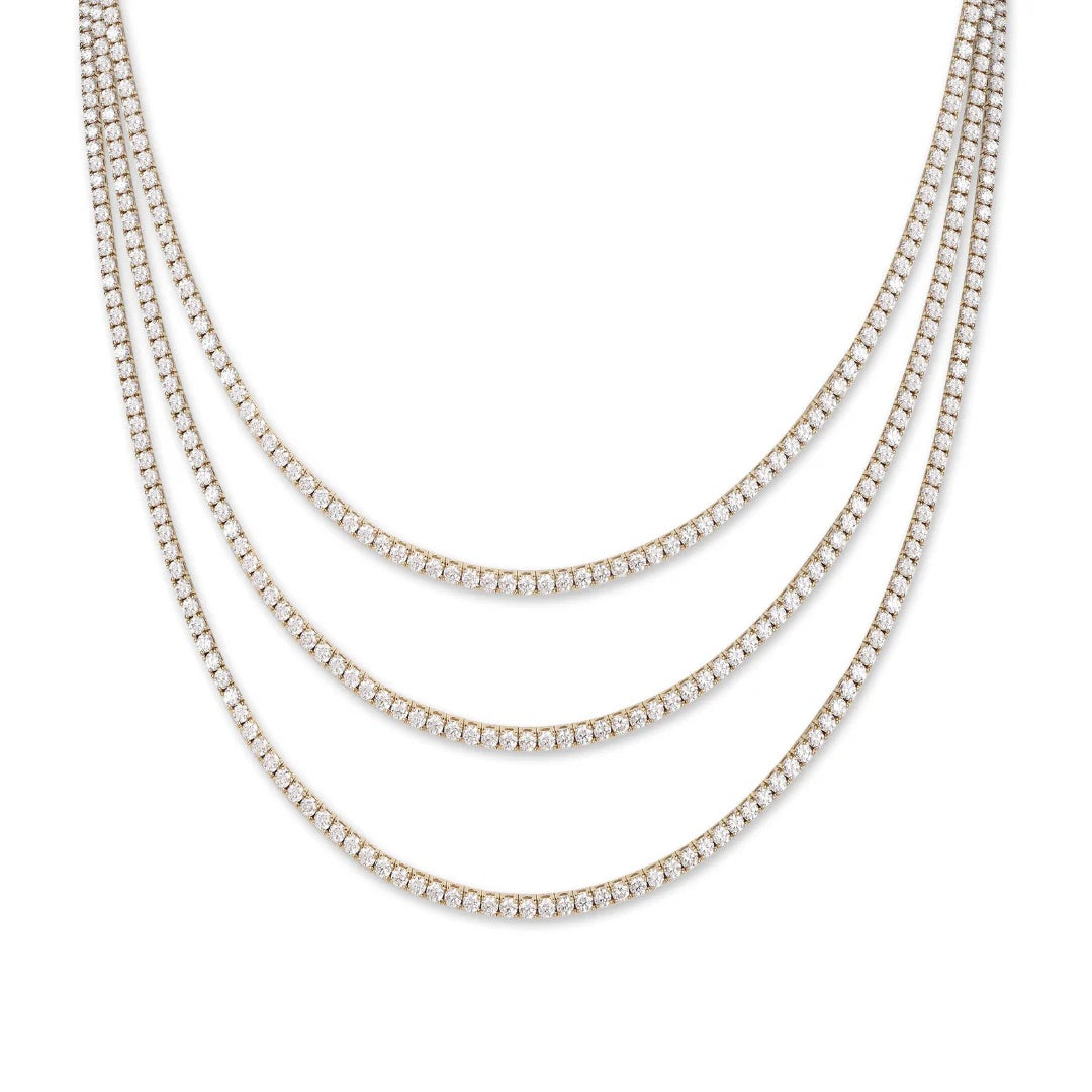 This elegant 16" tennis necklace features 14kt gold and all-natural diamonds meticulously set to ensure they face forward, maintaining a flawless sparkle without flipping. Designed for lasting sophistication, it offers a timeless accessory that complements any ensemble with refined brilliance.