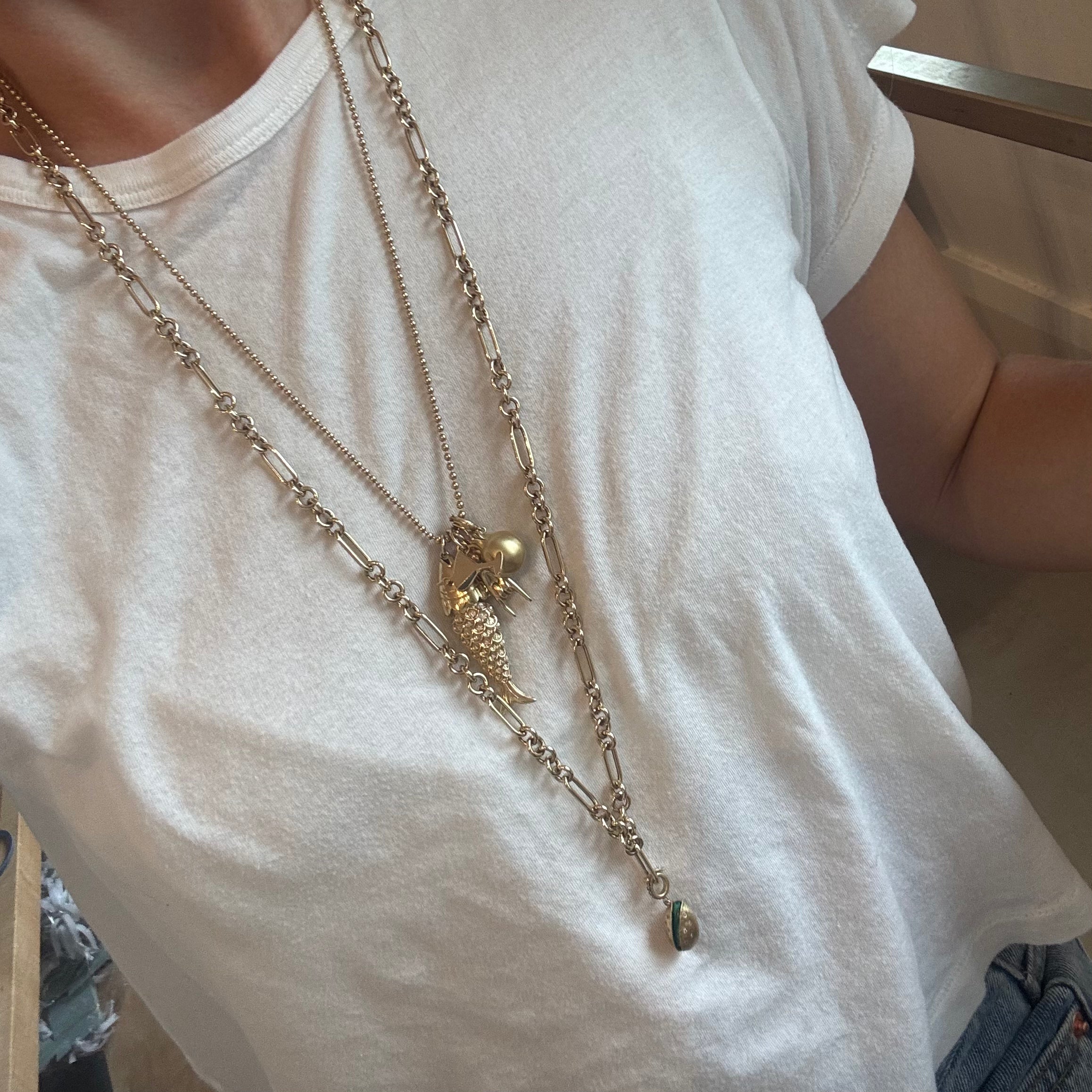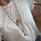 The Caroline Chain is a refined 14k yellow gold multi-link necklace measuring 32 inches. Its versatile length allows for elegant layering or a chic double wrap, adding a sophisticated touch to any ensemble. Perfect for those who appreciate subtle luxury and timeless style.