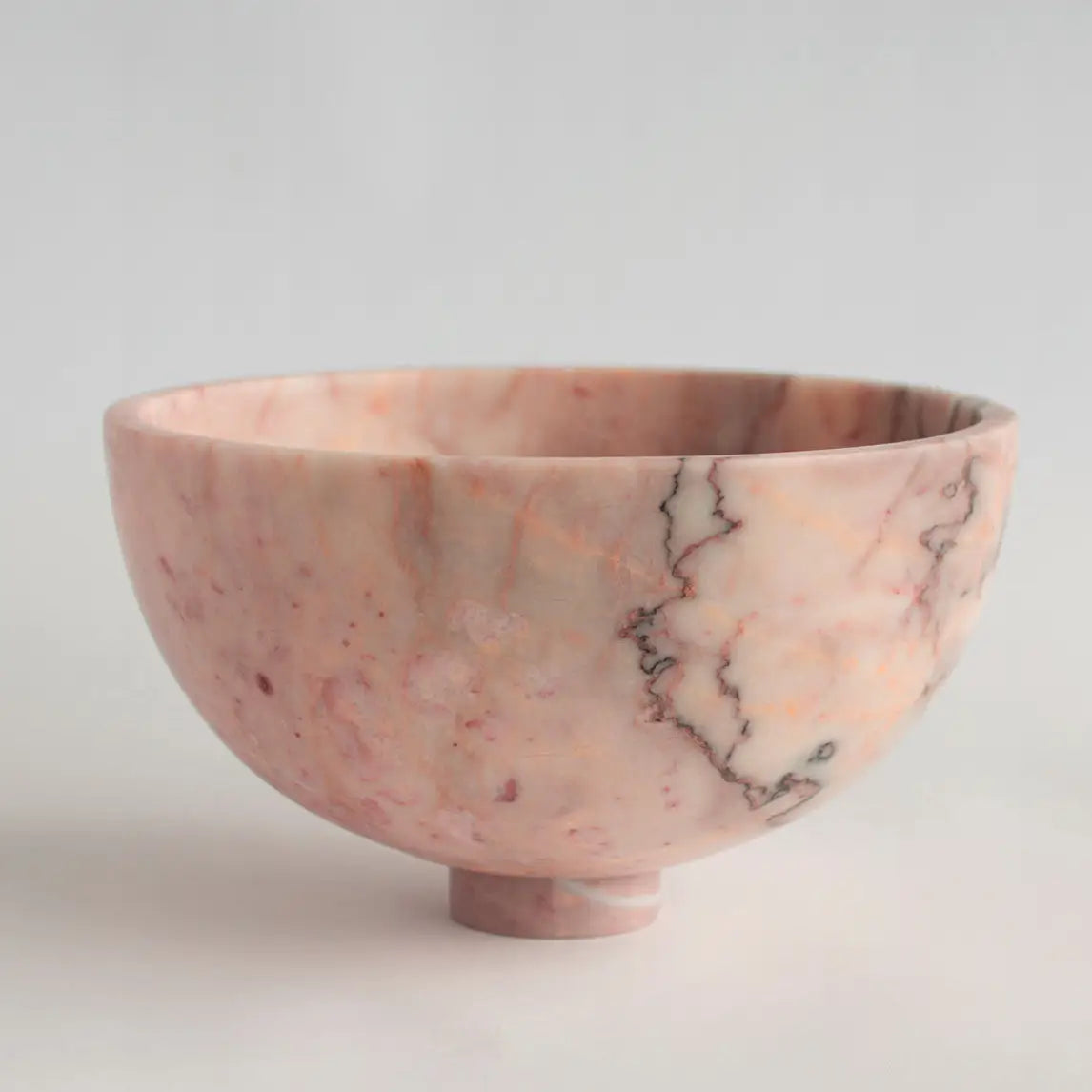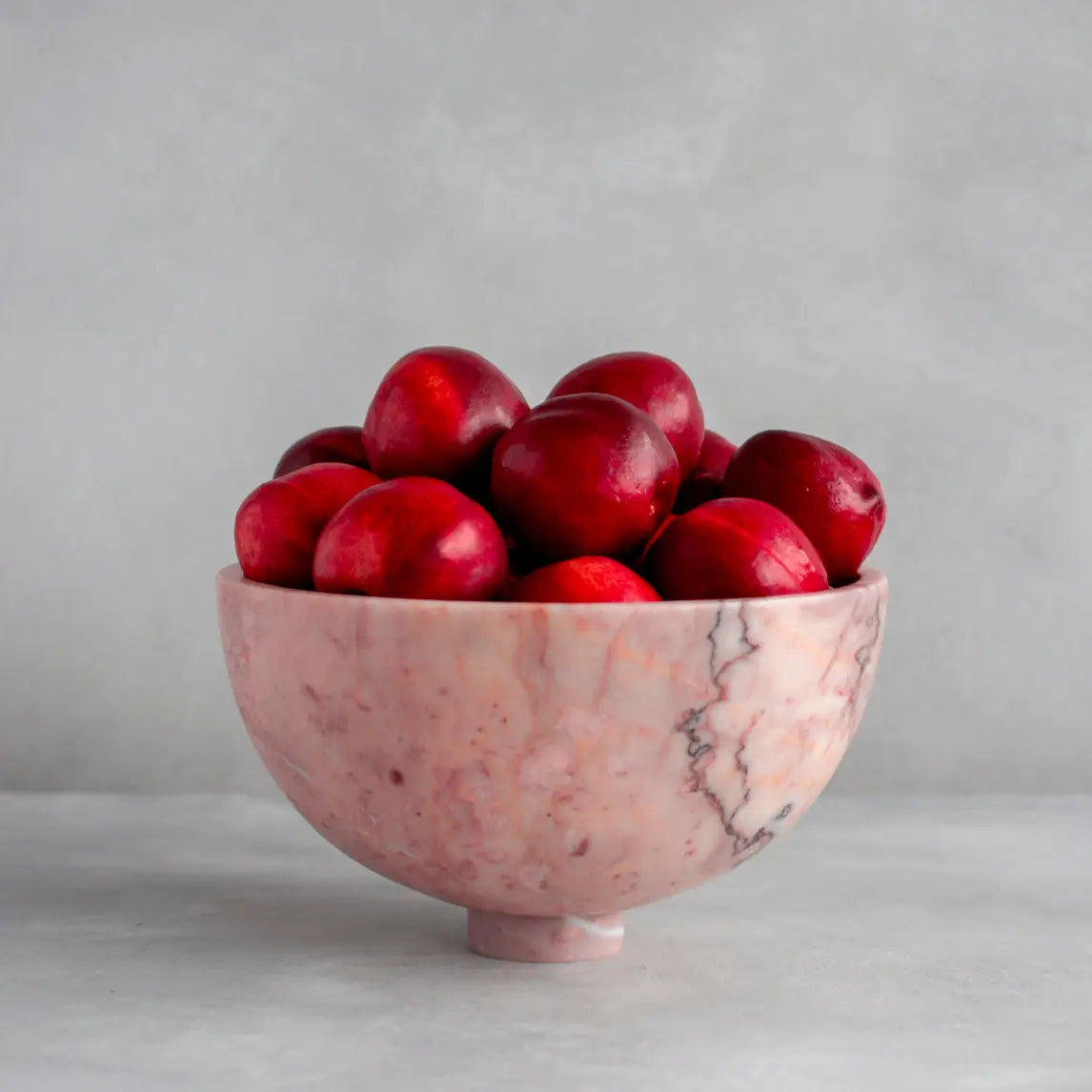 A substantial pink marble bowl with unique white veining rests atop a mini pedestal for a grand presentation of fruits and vegetables. It is truly an eyecatcher in your dining room.  There may be natural variations that are not product flaws, they make your design truly one-of-a-kind.