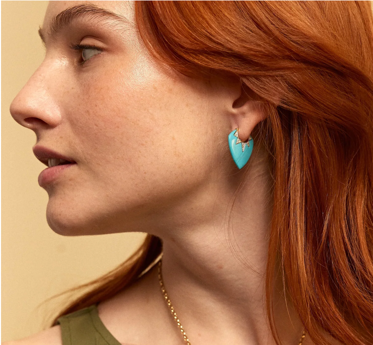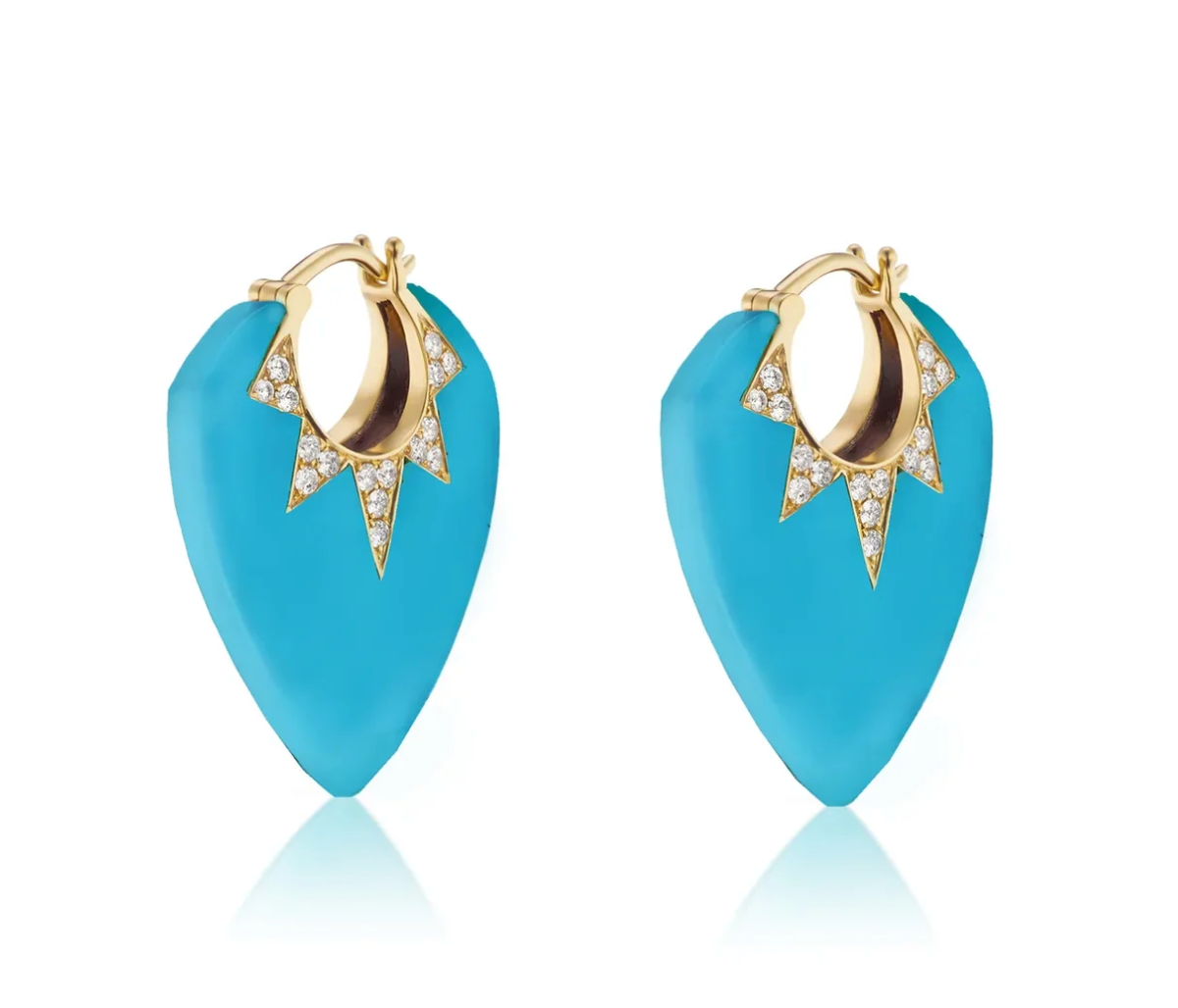 Awaken your inner rockstar with these handcrafted 18K yellow gold earrings in a guitar pick shape with carved turquoise and 0.48 cttw G-H/SI diamonds. 25mm x 20mm.