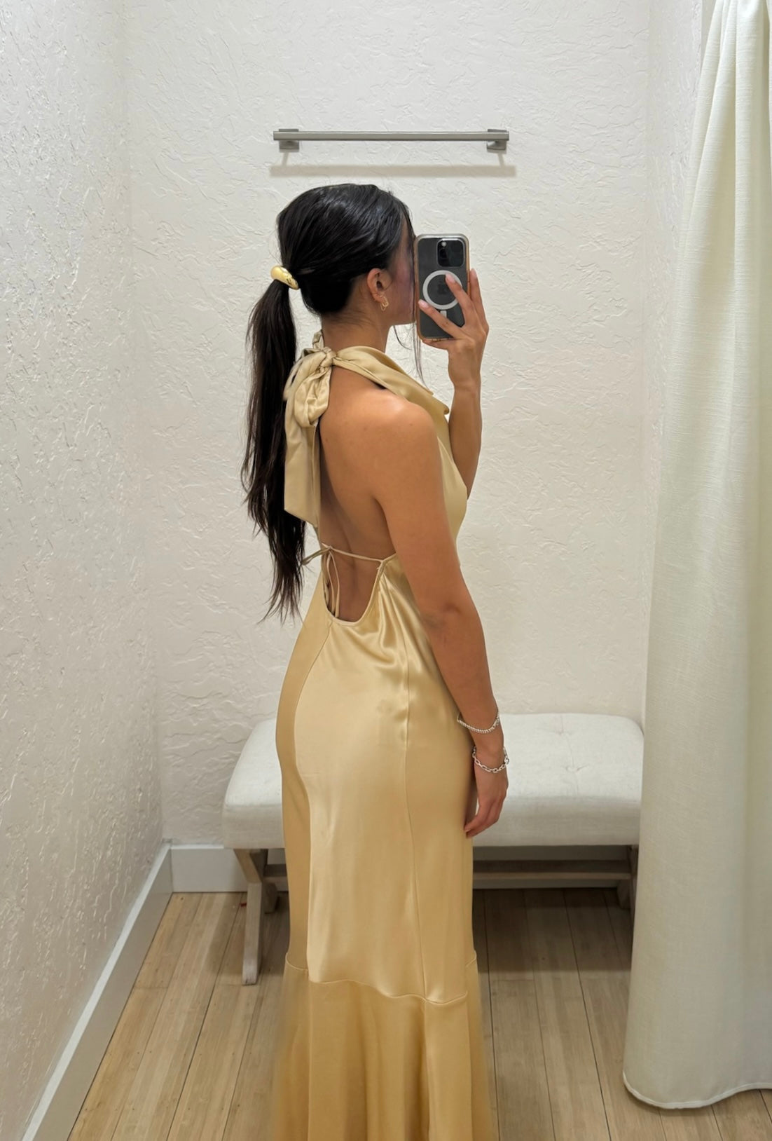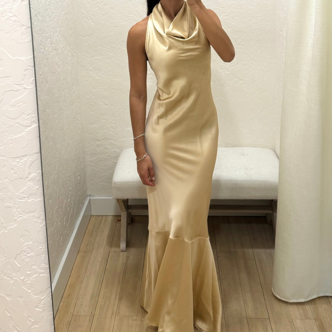 The perfect fit for your next big occasion. Cut on the bias to fall against your body in the most flattering way, with a luxurious neck tie.