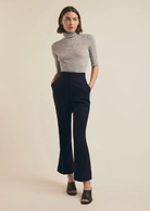 Add some flare with the Phoebe Pant. Made from a classic navy pinstripe with stretch for added comfort, the pant is cut for a tailored fit and finished with back welt pockets and flared hem.