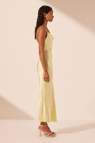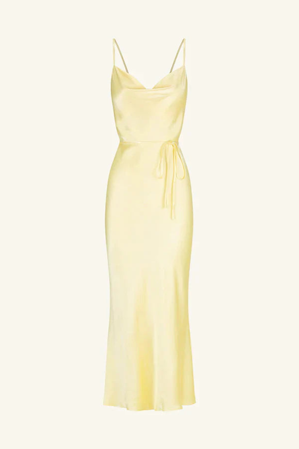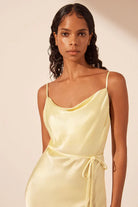 Bias cowl midi dress in lemon in a silk touch fabric with a luxurious sheen.