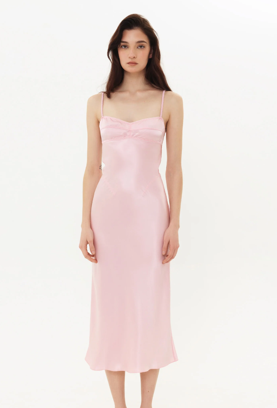 Anna October's iconic Waterlily dress is a sleek day to night dress that emphasizes the most delicate lines of the body. The dress is graced with a bustier-style bodice, an open back, adjustable straps, and gentle zigzag stitches. Its floor-length skirt and flawless bias cut make the dress a perfect choice for a cocktail evening or any special occasion. The dress is crafted from fabric created using recycled plastic bottles.