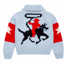 The cowboy is one of GOGOs best selling pieces. A cowboy motif on the classic cardi body. Straight body and arms, side pockets, shawl collar 3-4 porcelain buttons.