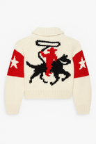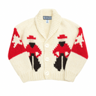 The cowboy is one of GOGOs best selling pieces. A cowboy motif on the classic cardi body. Straight body and arms, side pockets, shawl collar 3-4 porcelain buttons.