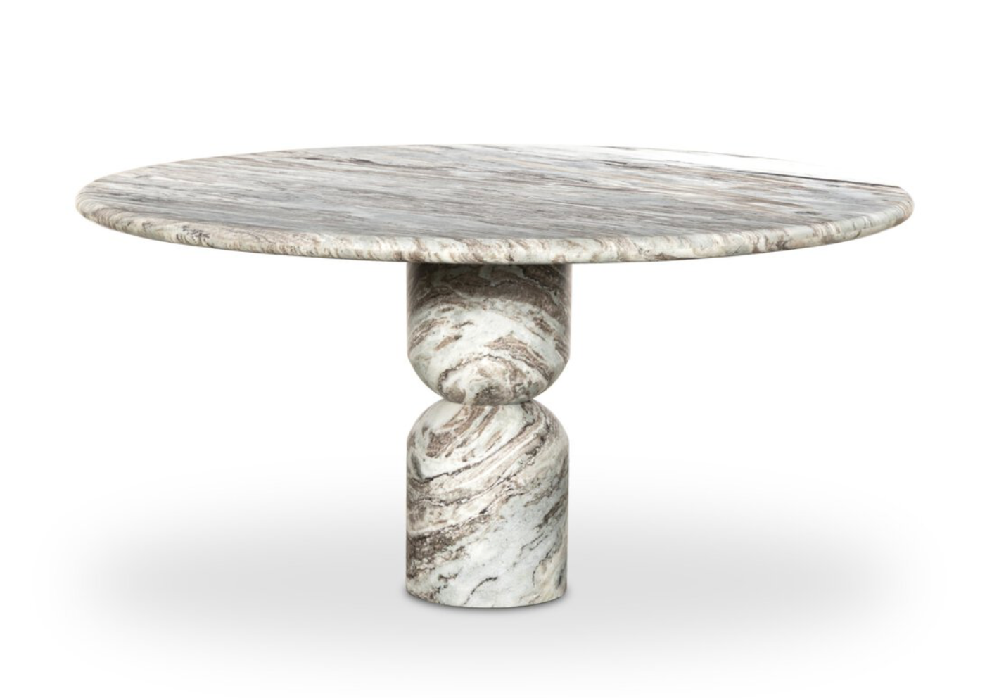A simple, sculptural dining table. Soft curves define the movement in the silhouette and veining of marble, accented by various shades in this natural material. Dreamy brown marble. 60"