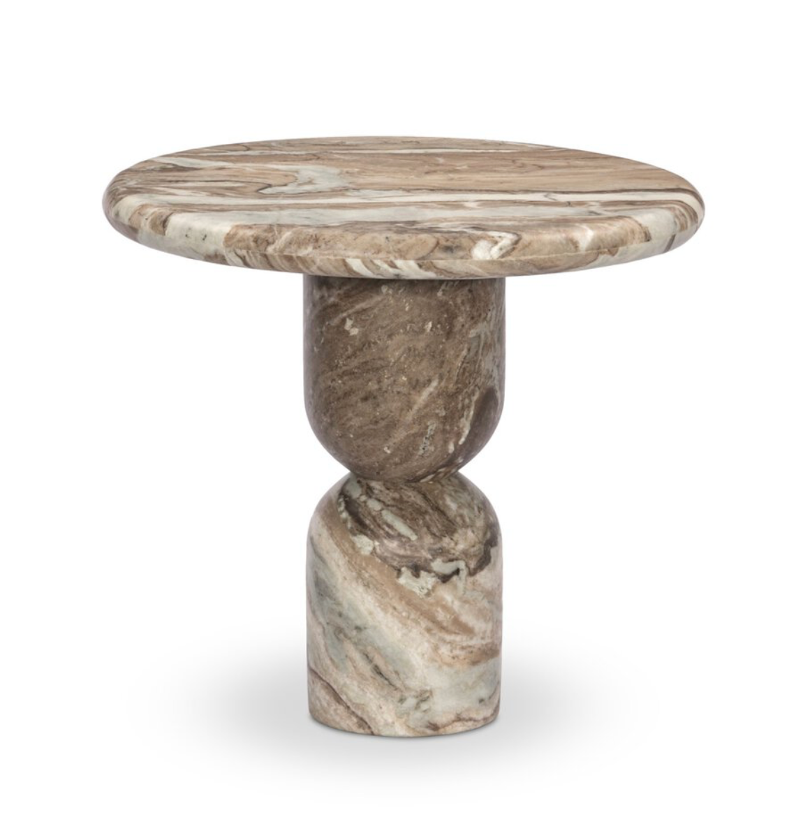 A simple, sculptural end table. Soft curves define the movement in the silhouette and veining of Sawar marble, accented by various shades in this natural material. Dreamy brown marble. 21"