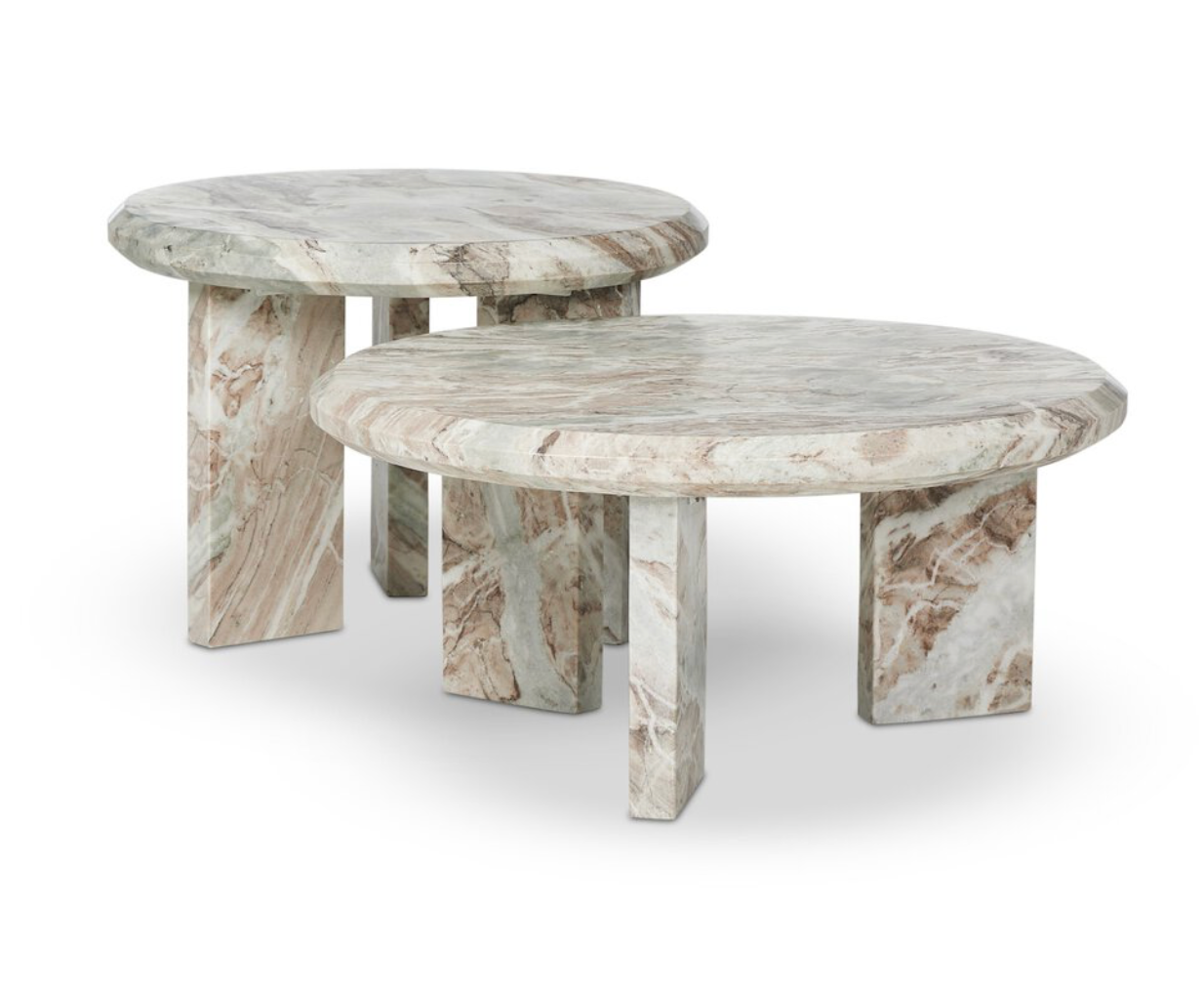 Made from solid Sawar Indian marble in a creamy taupe, a set of nesting tables features block legs and chamfered edges, for a classic look with plenty of natural character. Variation in marble color and veining to be expected. 32"