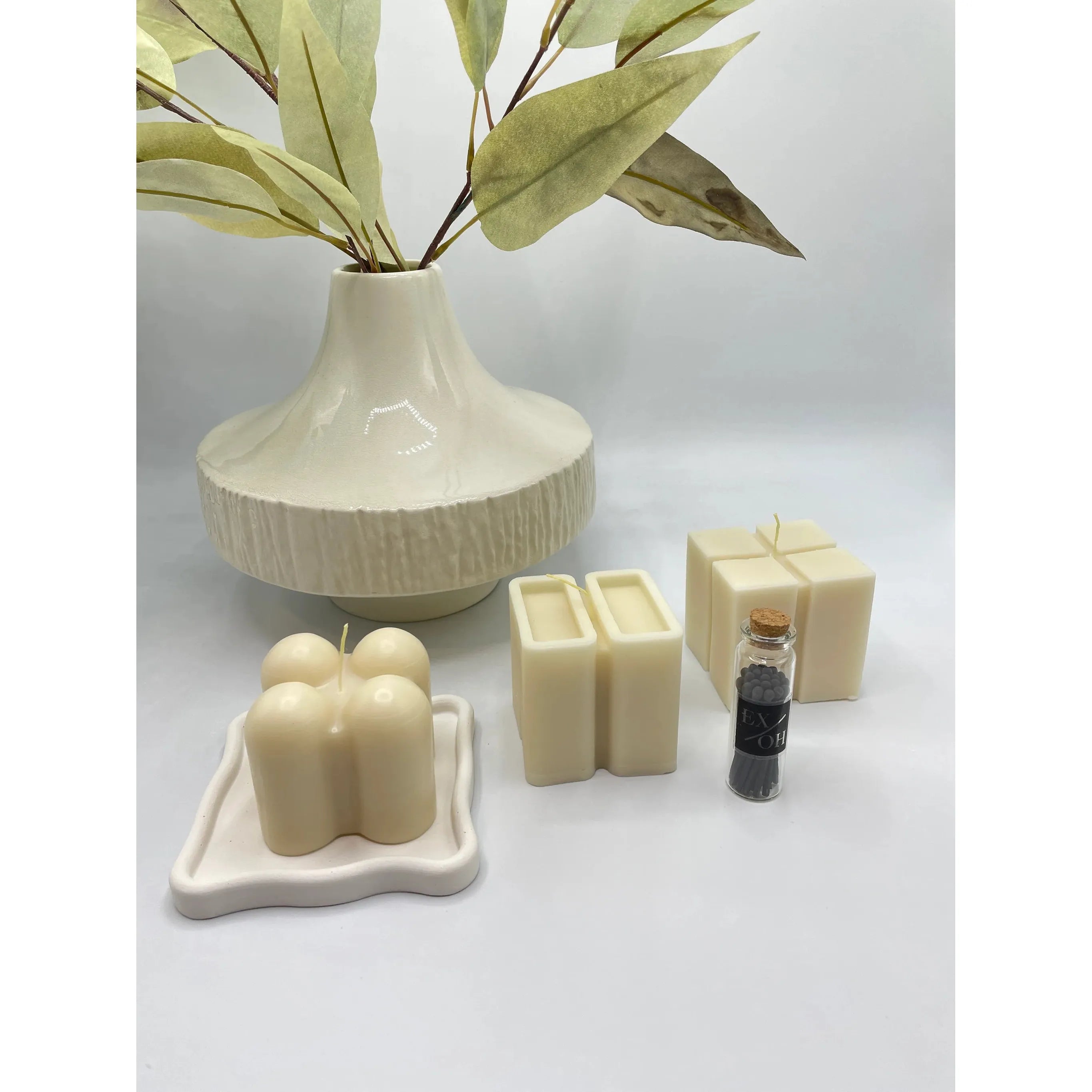 Colour - Piña Colada - This coconut lime scented gift set contains 3 candles from our first collection, a hand poured concrete plate and a glass jar filled with unique black on black matches. The candles included in this set are NO.1, NO.2 and NO.4 and all have the same scent. Each candles is 2.5" x 2.5" and has 40+ hours burning time.