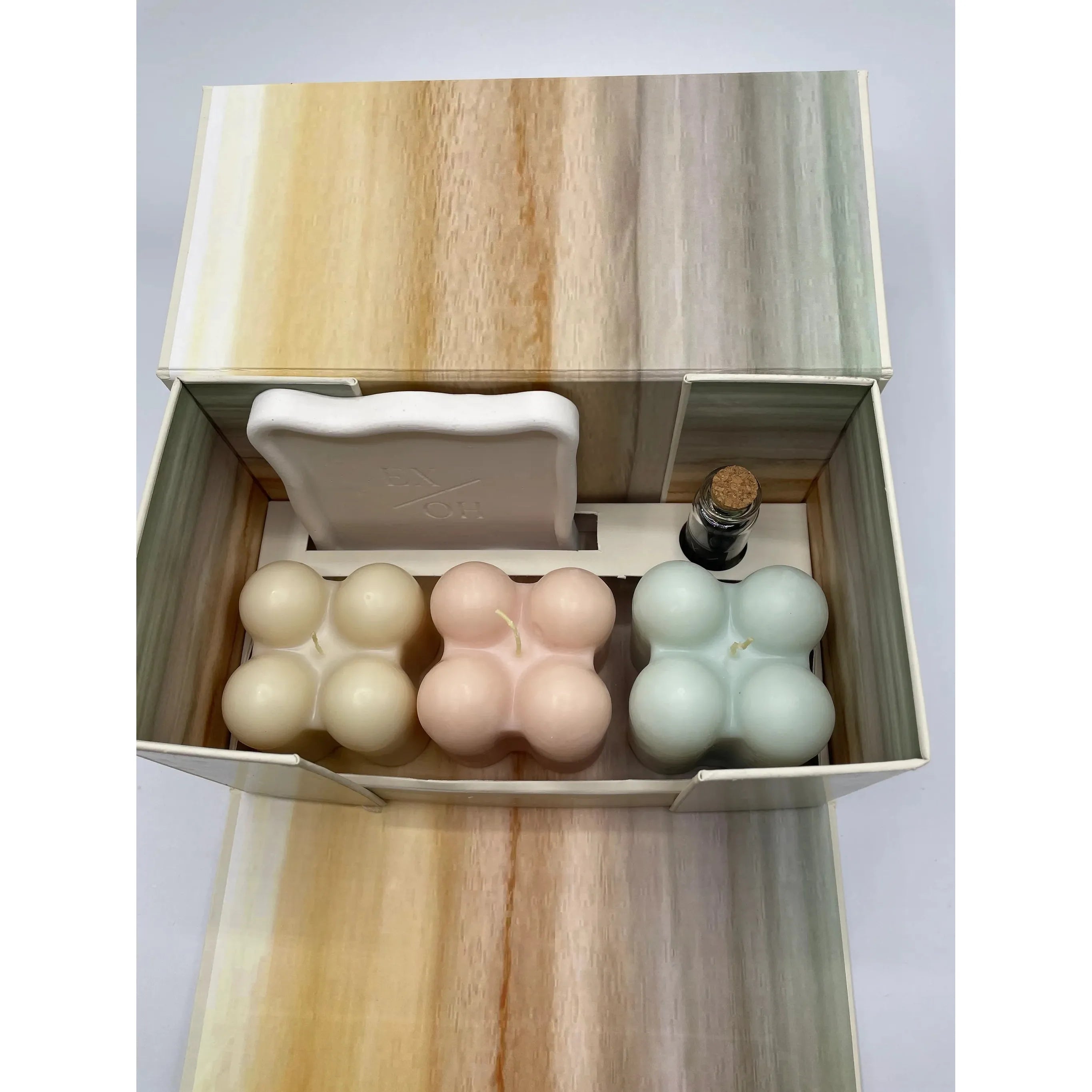 Colour - Bouquet (New) - This gift set contains 3 candles, a hand poured concrete plate and a glass jar filled with unique black on black matches. The candles included in this set are all NO.5 with 3 different scents including Ambrosia Sage, Hot Summer Night and Cherry Merlot. Each candle is 2.5" x 2.5" and has 40+ hours burning time.