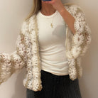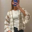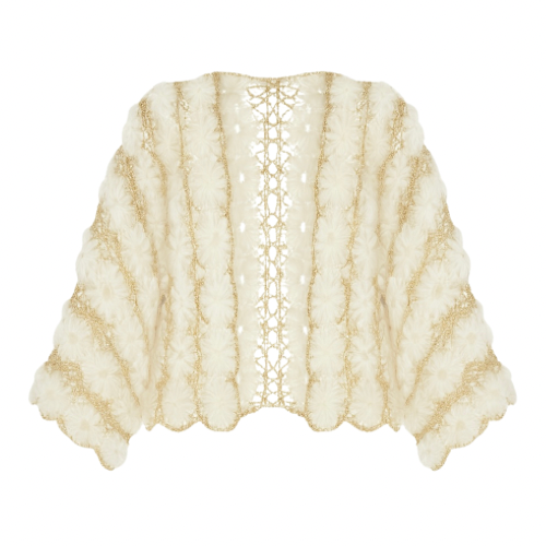 Discover the enchantment of this handmade knitted cardigan that seamlessly blends romance with elegance. The unique floral pattern adds character, while the combination of soft mohair and lurex provides a shimmering touch, ensuring a distinctive style that won’t go unnoticed, whether you’re on an island getaway or exploring the city by night.
