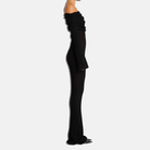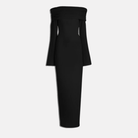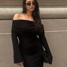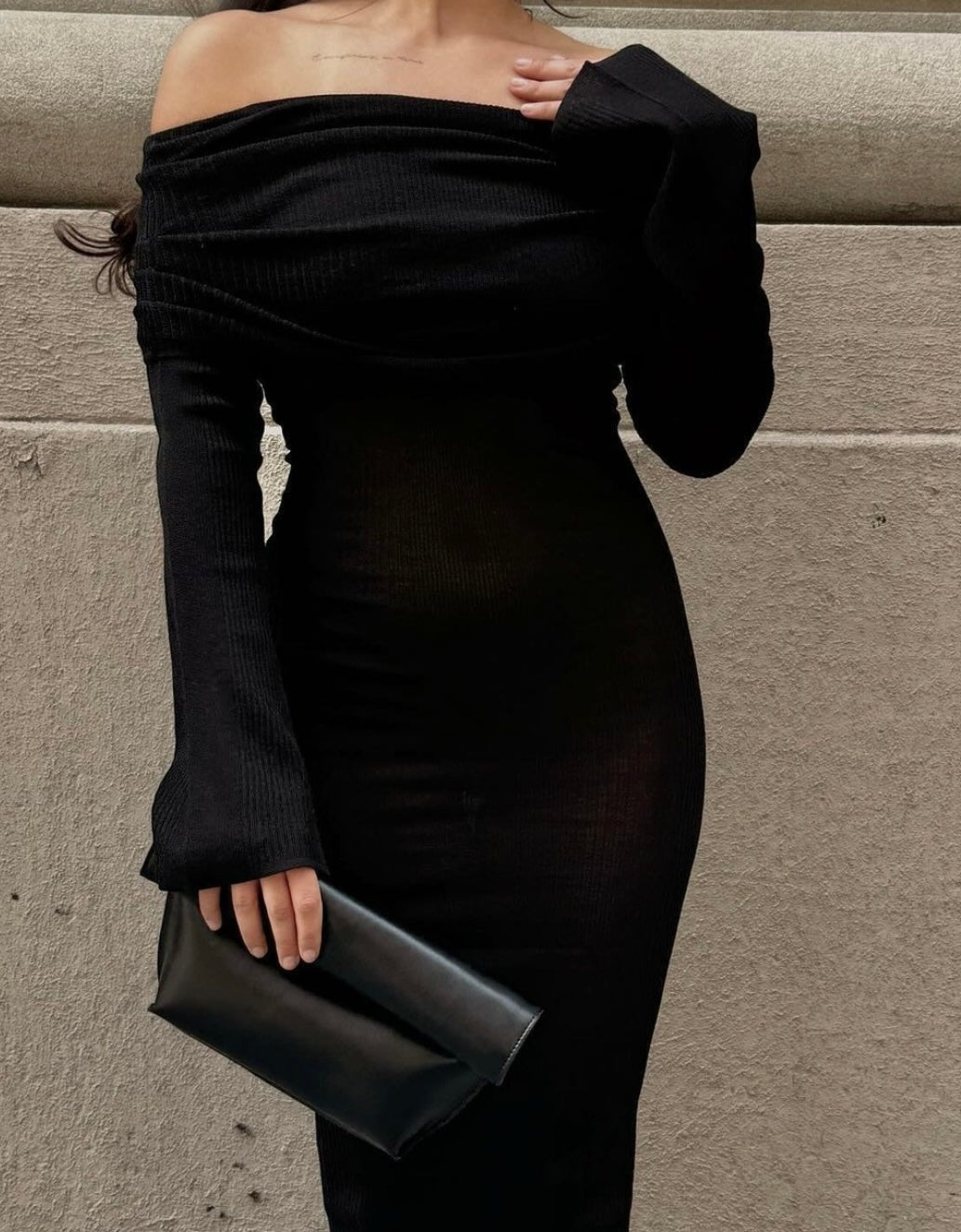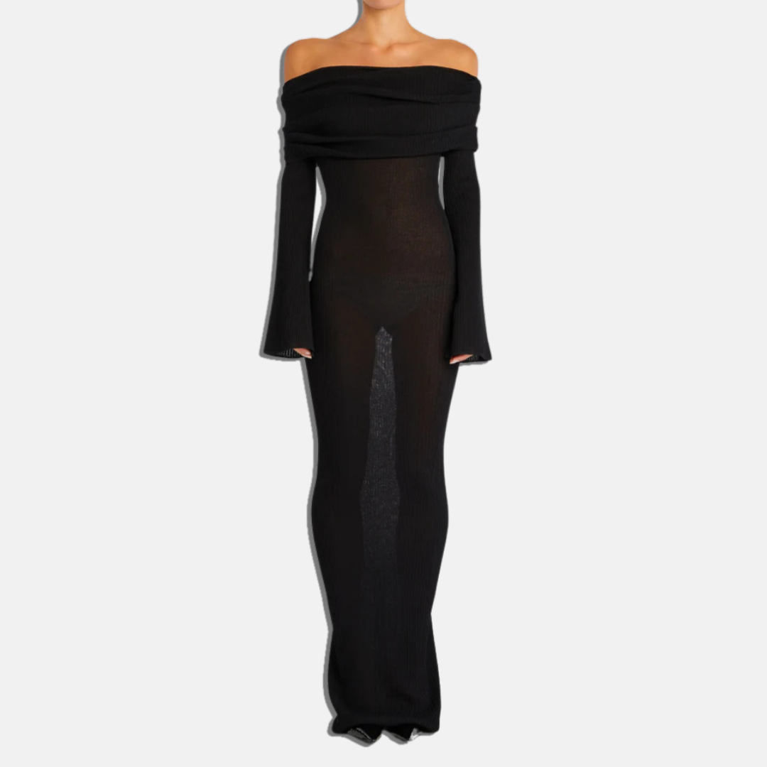 Knit, off-the-shoulder maxi dress with fold over neckline and long, bell sleeves. Shown here in Butter.