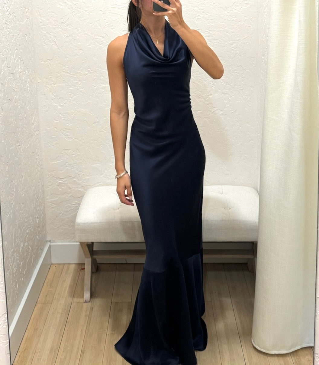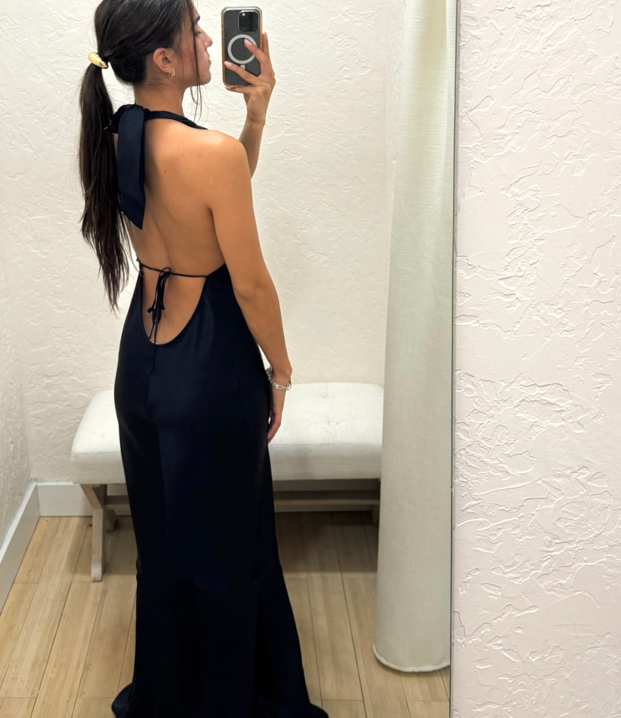 The perfect fit for your next big occasion. Cut on the bias to fall against your body in the most flattering way, with a luxurious neck tie.