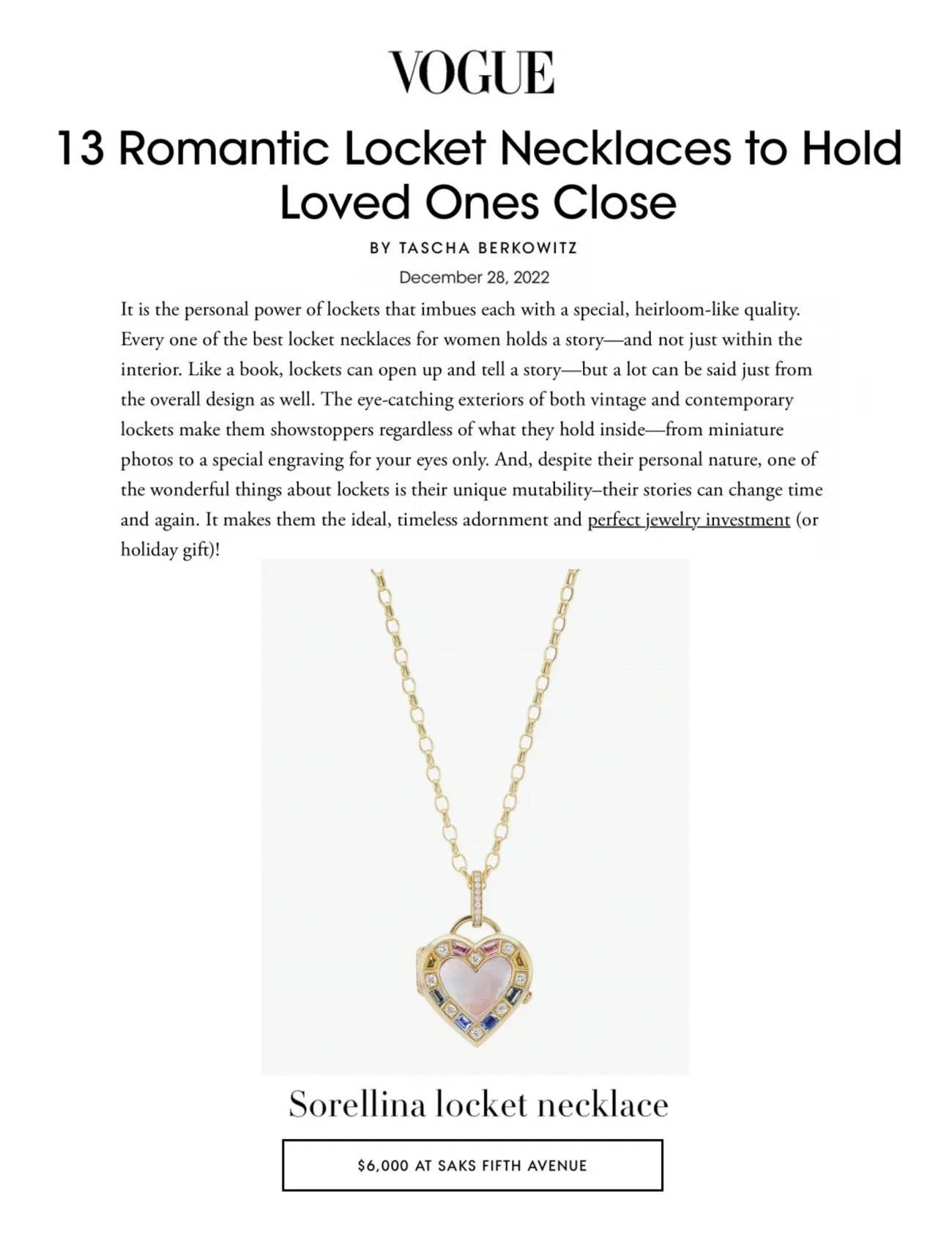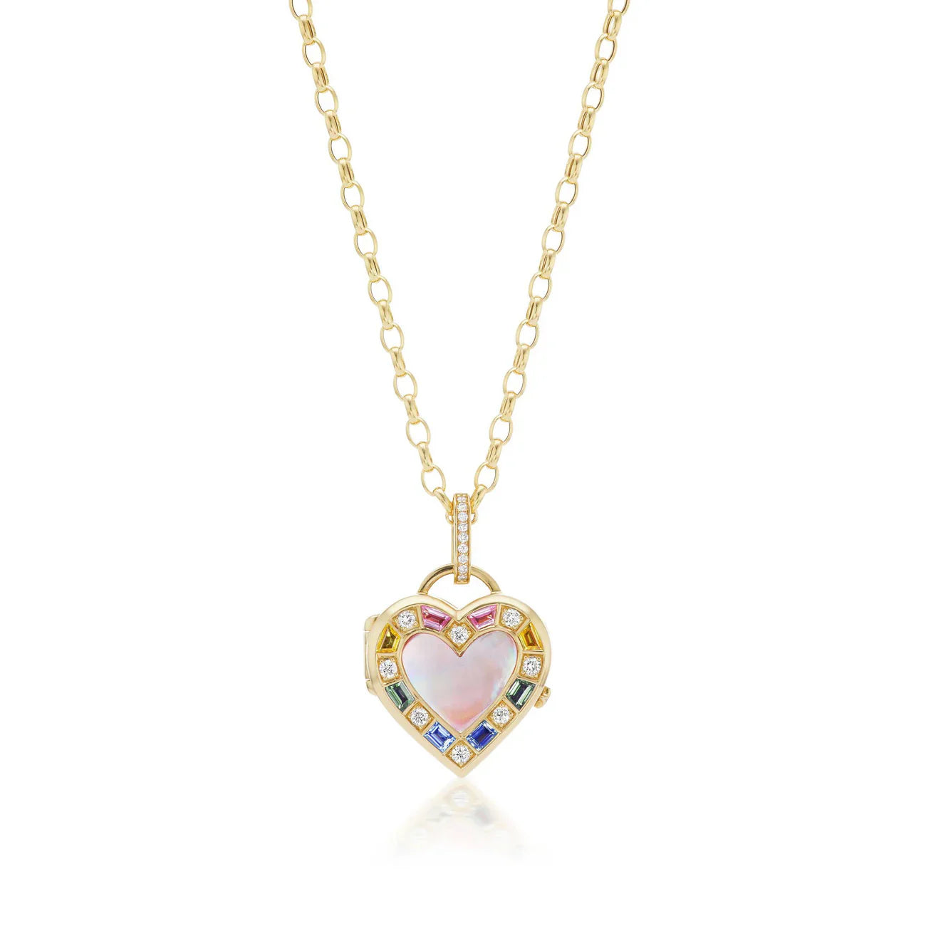 18k yellow gold locket with 2.01 cttw pink mother of pearl, 1.23 cttw rainbow sapphires, and 0.03 cttw G-H/SI diamonds. 30 mm x 20 mm
