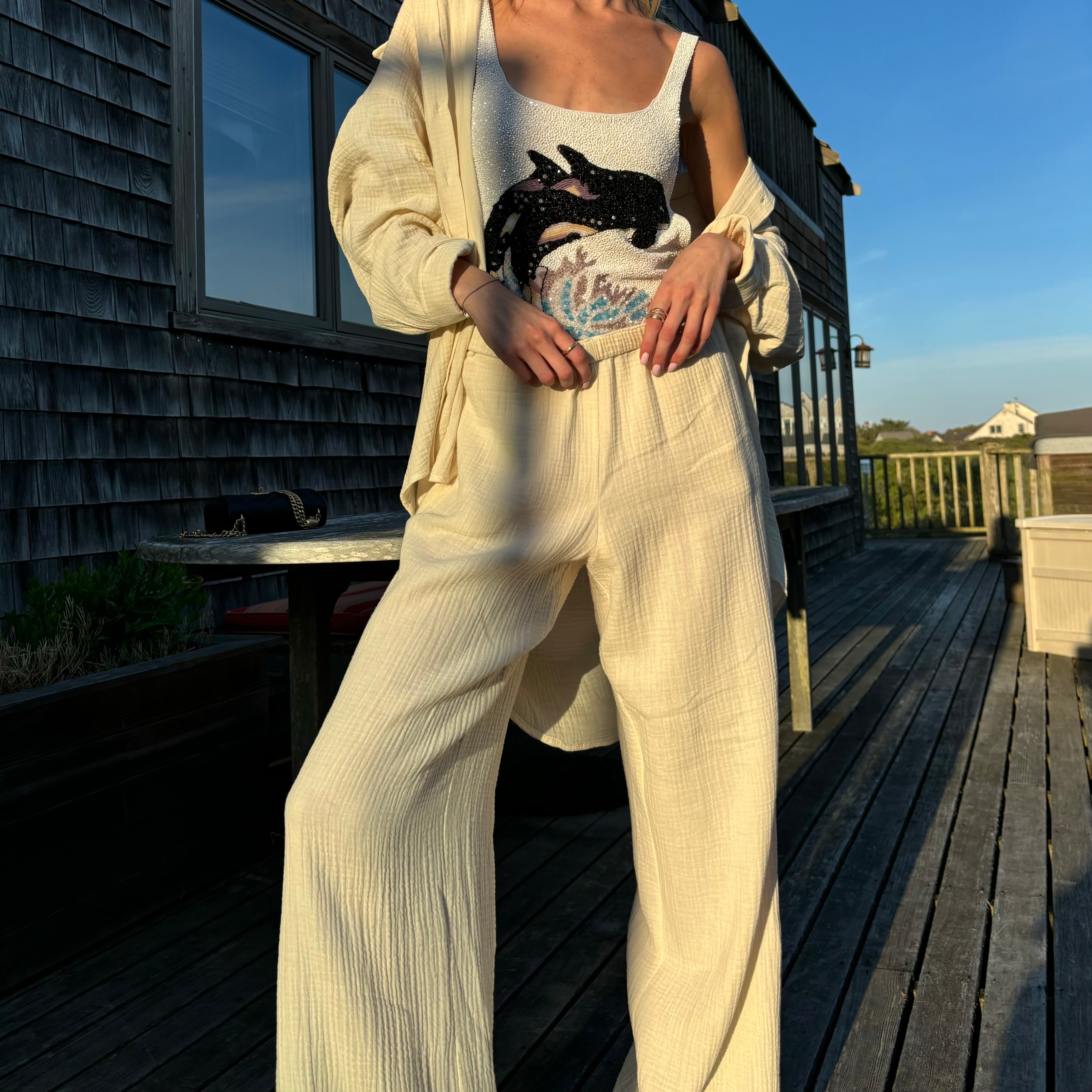 Cozy, comfy, chic gauze pants for lounging or running errands. Pair it with The Paulie Shirt for a perfect matching set.