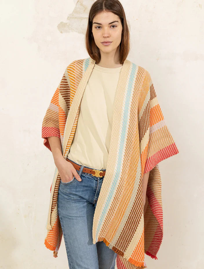 The Kaftan Aline is beautifully handwoven in natural wool textiles. It is the perfect neutral yet bold piece to accompany you everywhere from the beach to the fireplace. It is handwoven by artisans in Peru from exclusive merino yarns that are specifically hand dyed to order.