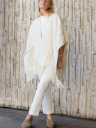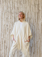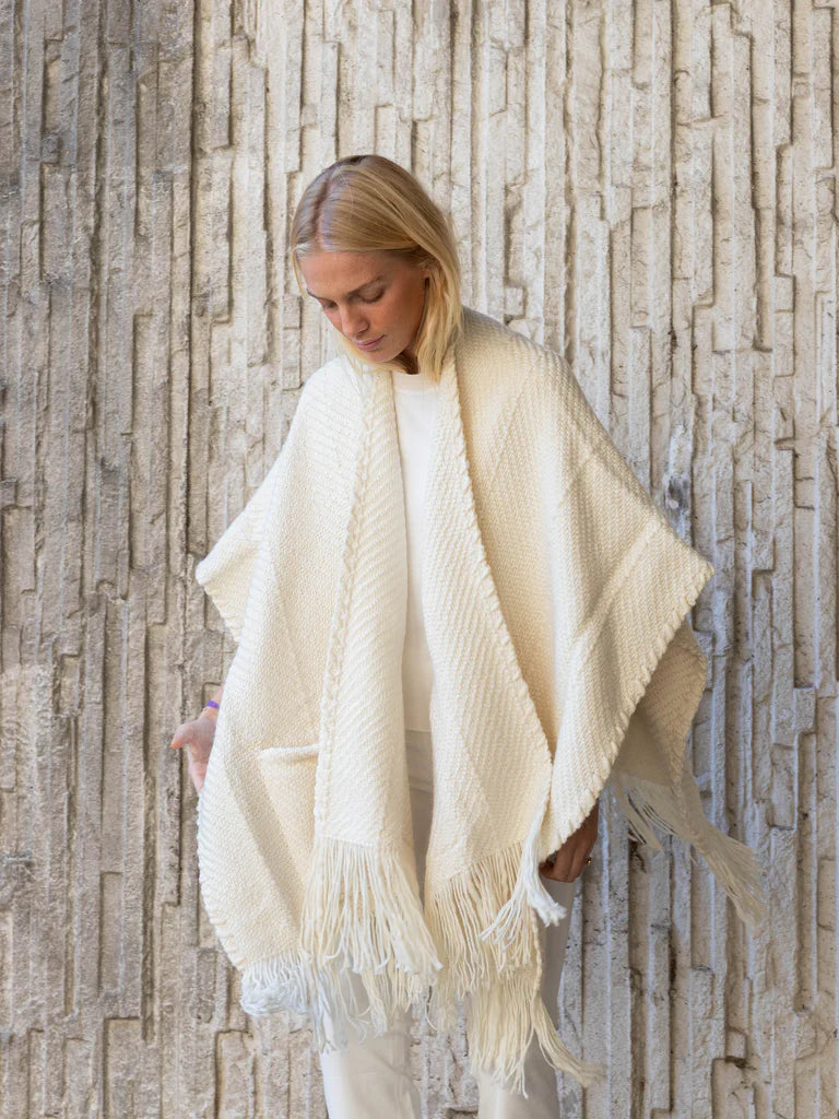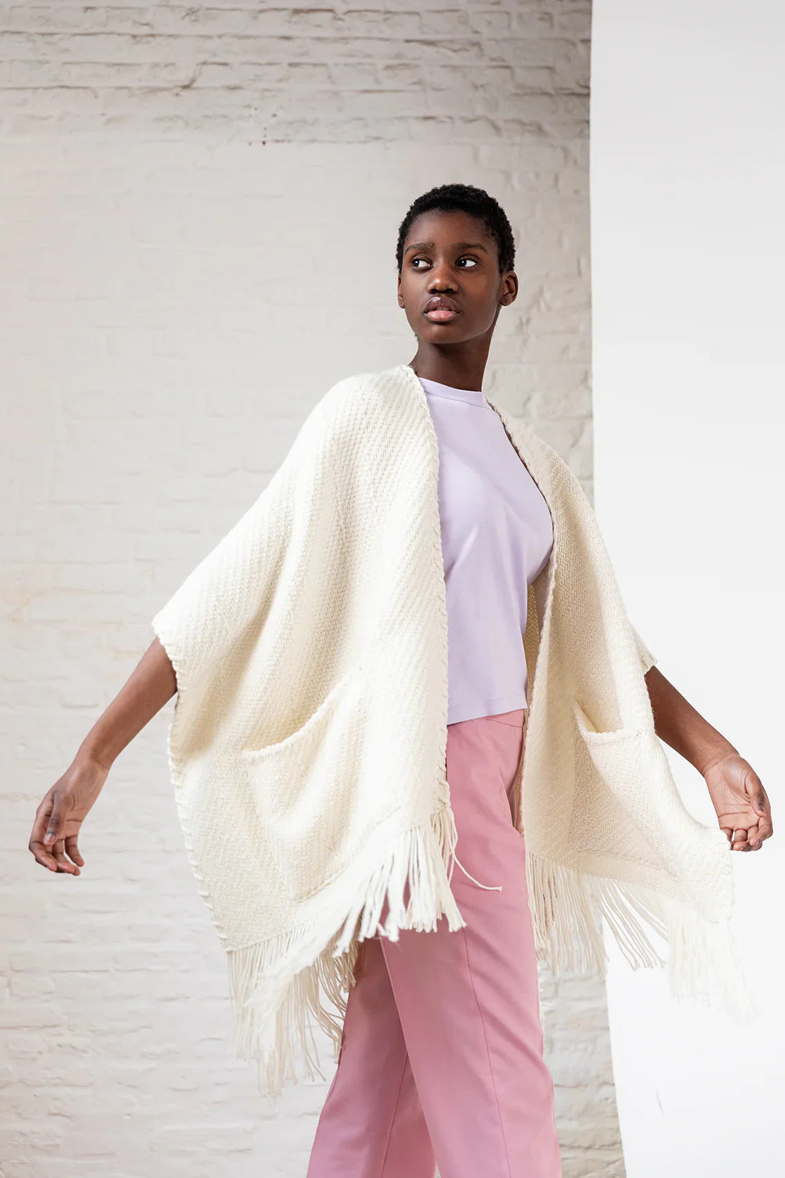 In timeless natural Ivory, the Anastasia Cape from WEHVE will always be your perfect companion piece. It is handwoven by artisans in Peru from sumptuous 100% natural yarns that are specifically made to order for WEHVE. The oversized design is bordered with long tonal fringe detailing and 2 Pockets on the front, the sides are open, the front panel can be worn over the shoulder.