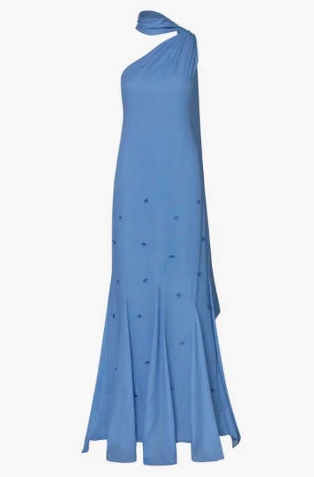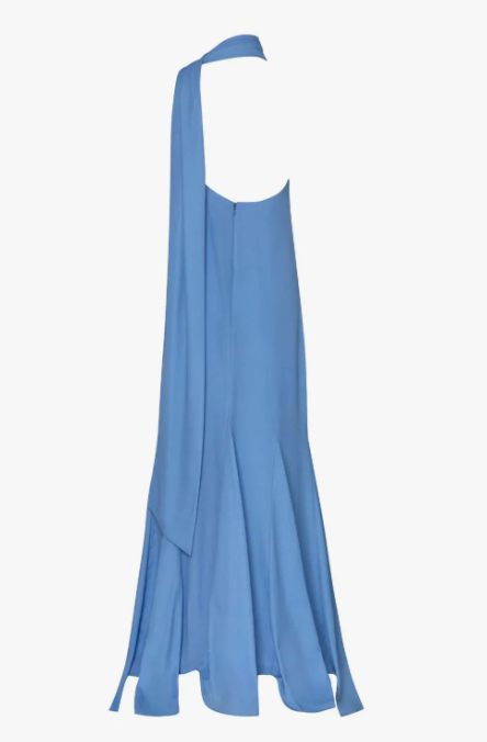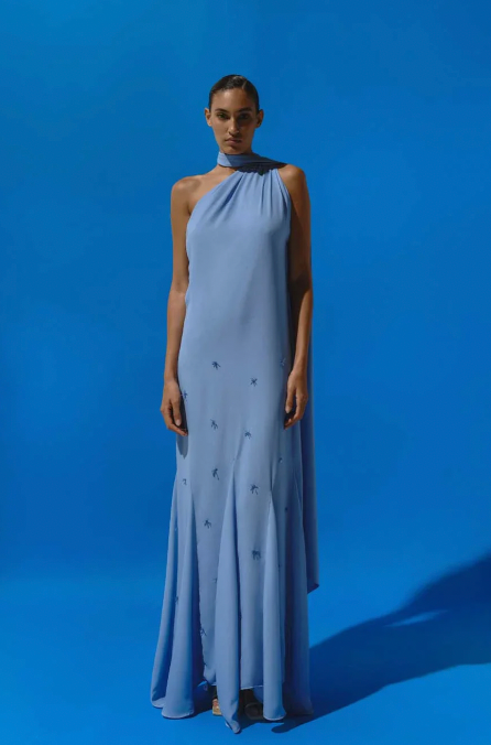 Introducing the "Ari Maxi Dress" in Misty Blue – a one-shoulder silhouette with open back, embellished detail, and flowing scarf accent. Designed with godets in the hemline for added movement, adjustable strap, back zipper closure, and fully lined in maxi length.