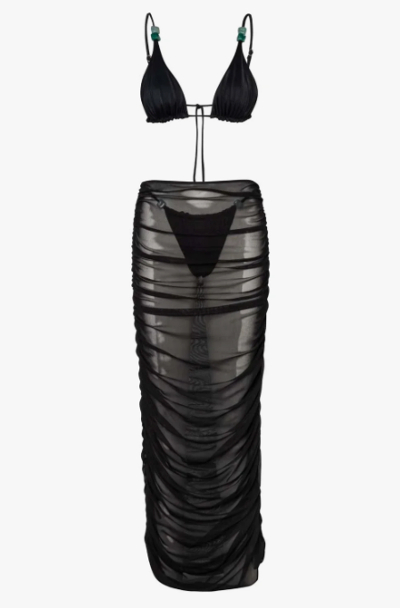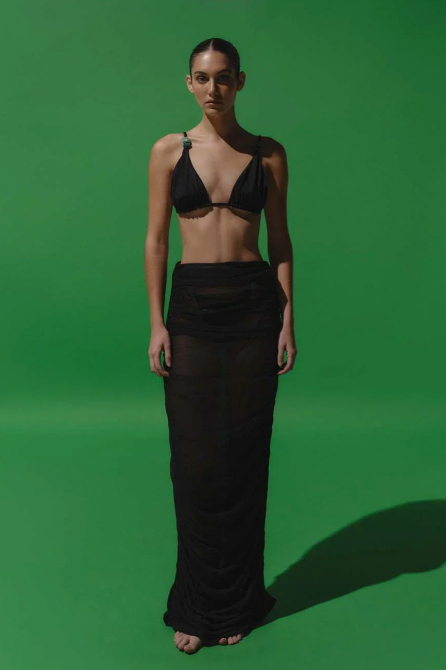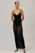 Introducing the "Bahia Maxi Pareo" in Black – a ruched cover-up crafted in sheer mesh fabric. Designed in a maxi length and left unlined for a lightweight, semi-transparent finish.
