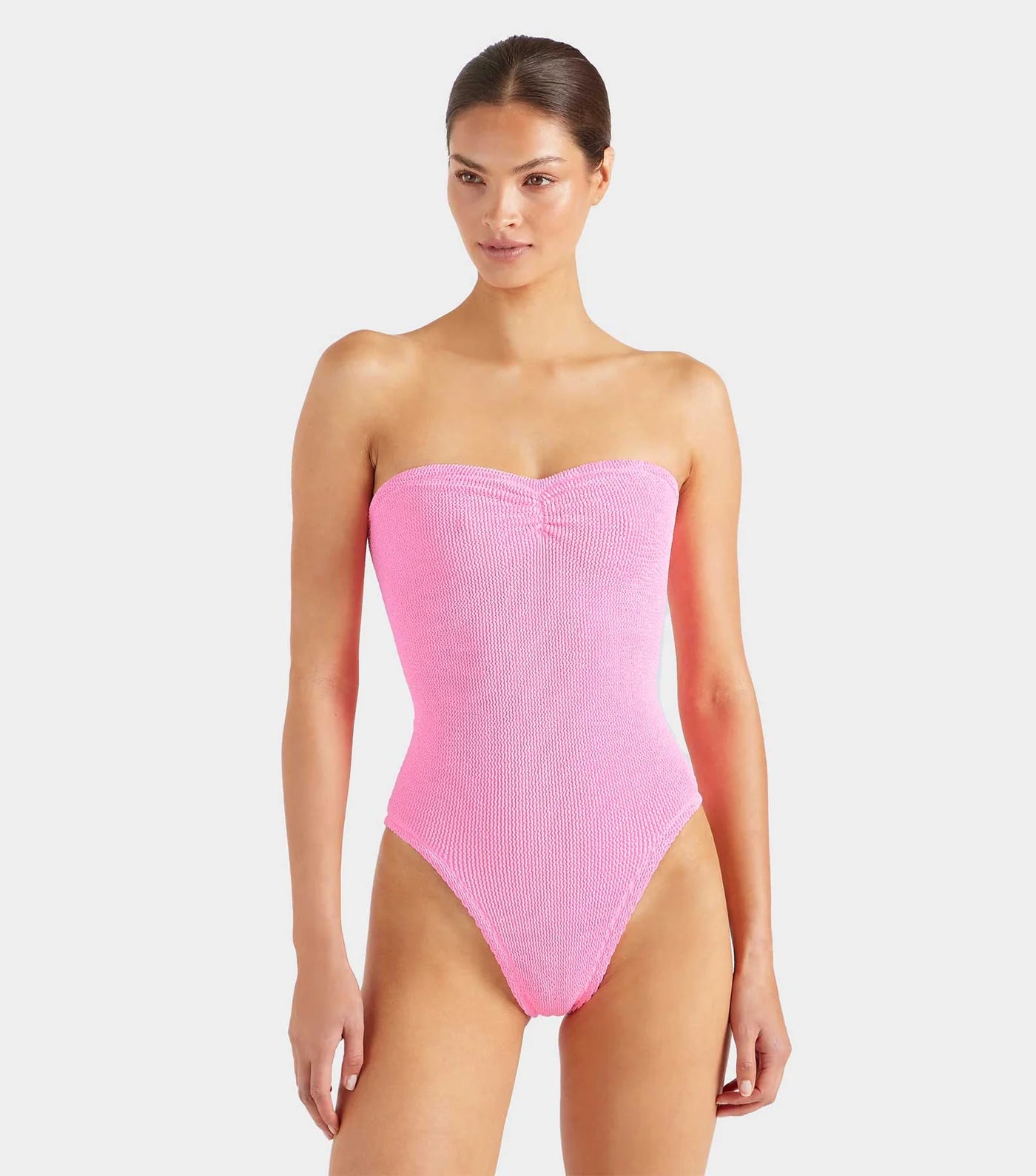 Strictly no tan lines in this strapless style. Minimal meets glam with the Brooke swimsuit's ruched sweetheart neckline and figure-sculpting silhouette.