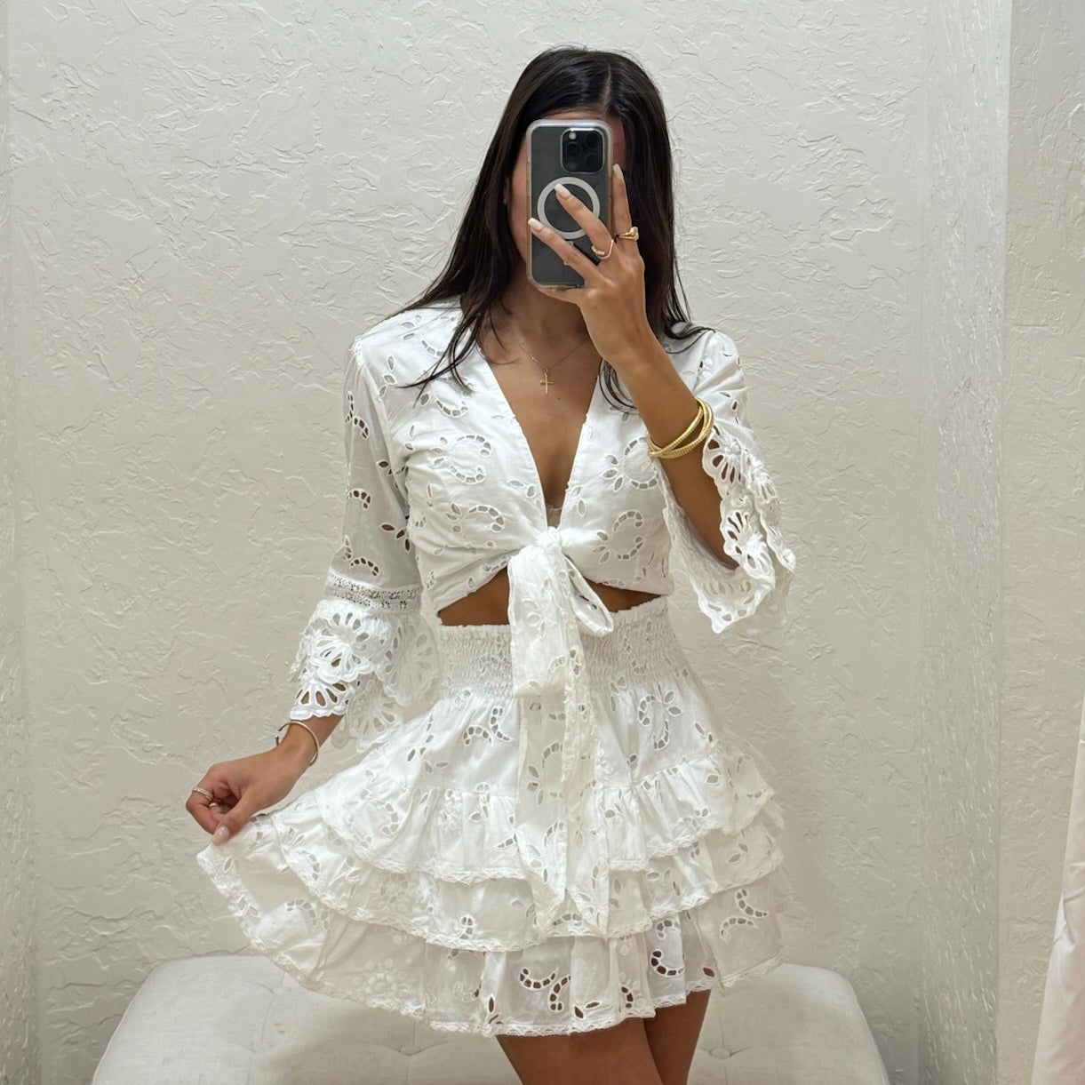 A linen top that pairs perfectly with your favorite high waisted denim jeans or with the matching tiered mini skirt.