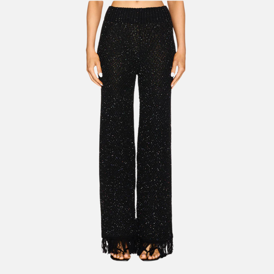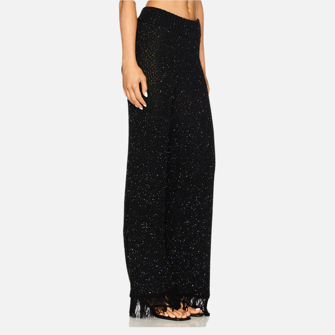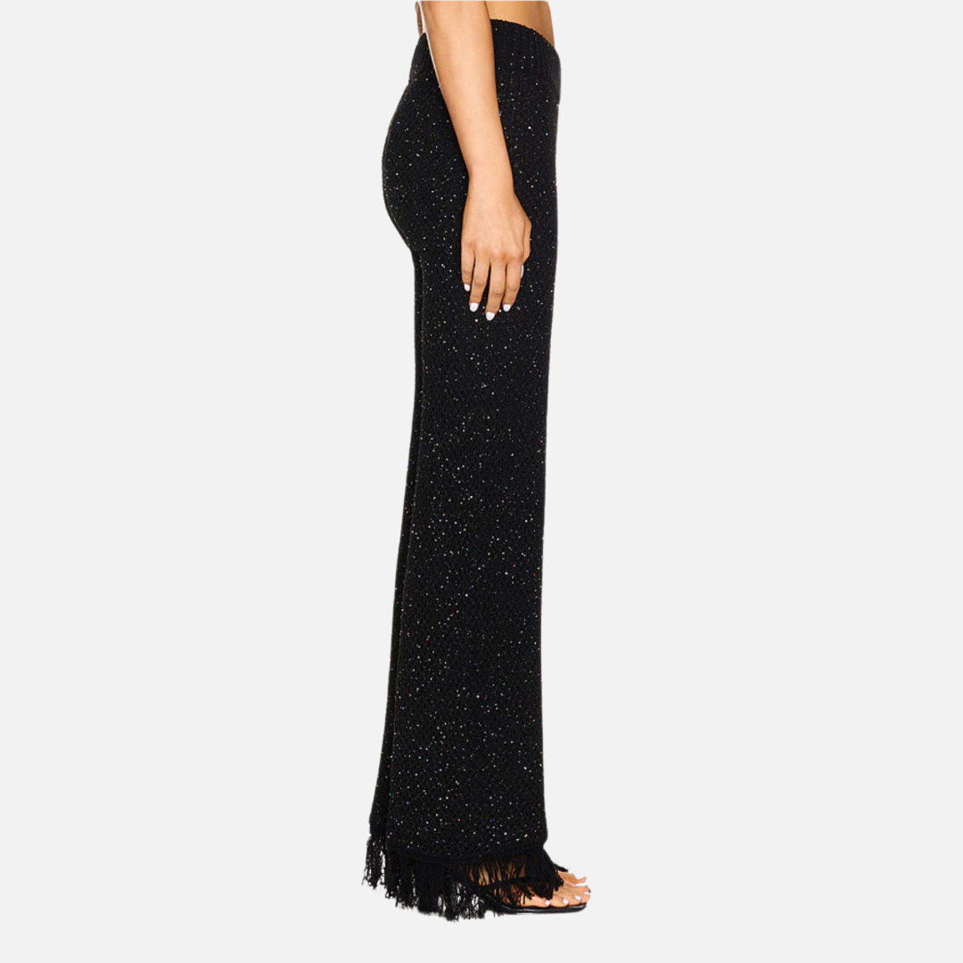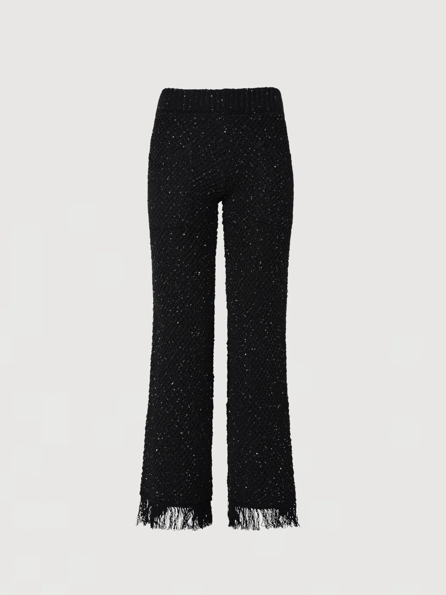 A nod to the nostalgic 70's and Italian disco-wear, a sparkling, basket-stitch knitted pant featuring ASTA's signature sequin-spun yarn, complete with a fringed hem.