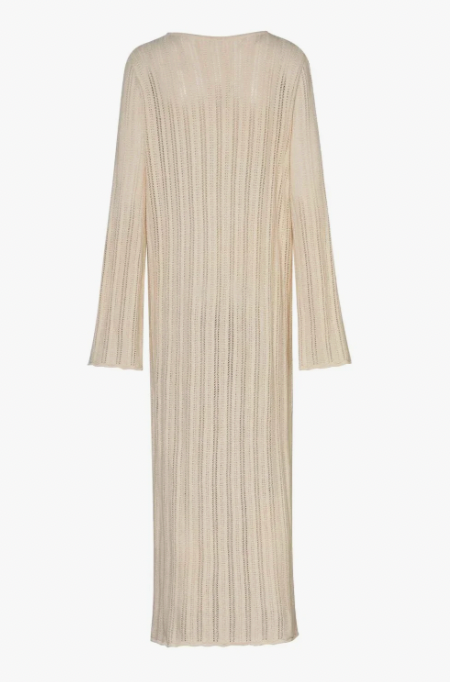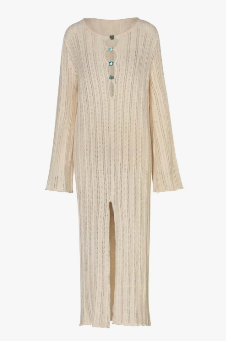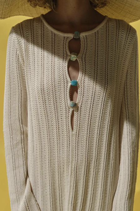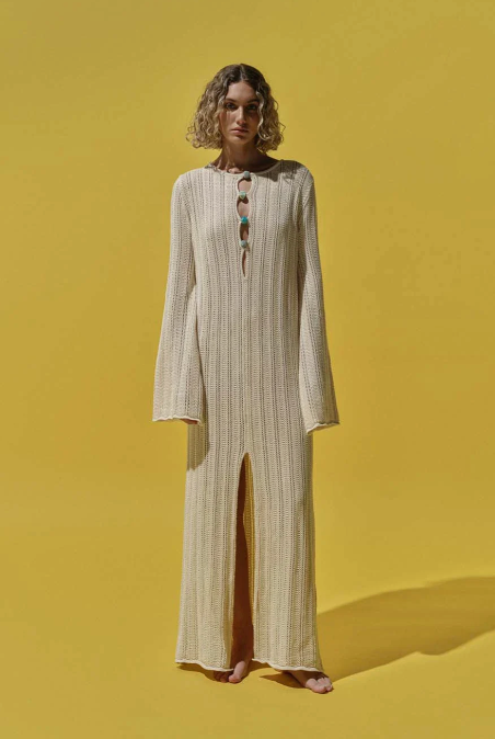 Introducing the "Mamu Maxi Dress" in Ivory – a round neckline silhouette featuring front cutouts and refined embellishments. Crafted in sheer knitted fabric, unlined for lightness, and completed with a front slit for ease of movement.