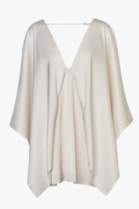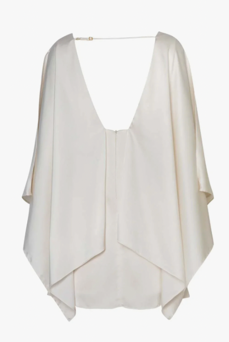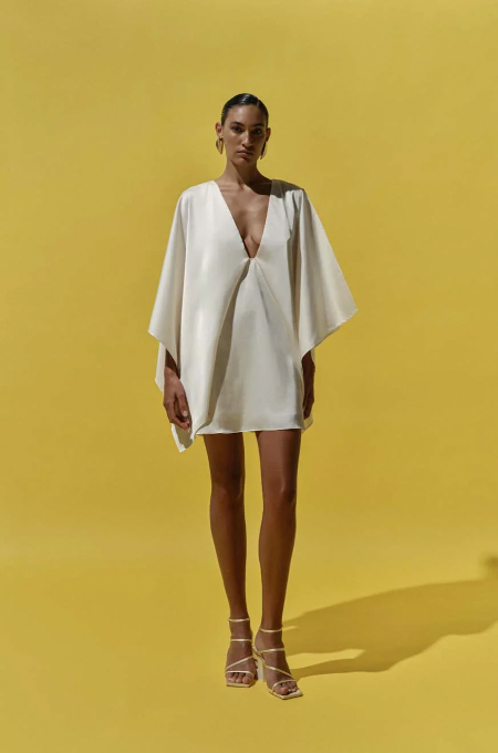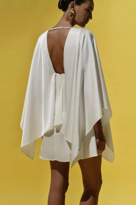 Introducing the "Pietro Mini Dress" in Ivory – a mini dress featuring a deep V-neckline, draped flowing sleeves, and an adjustable back strap for a customizable fit. Designed with an elastic silicone grip for support and a back zipper closure. Fully lined.