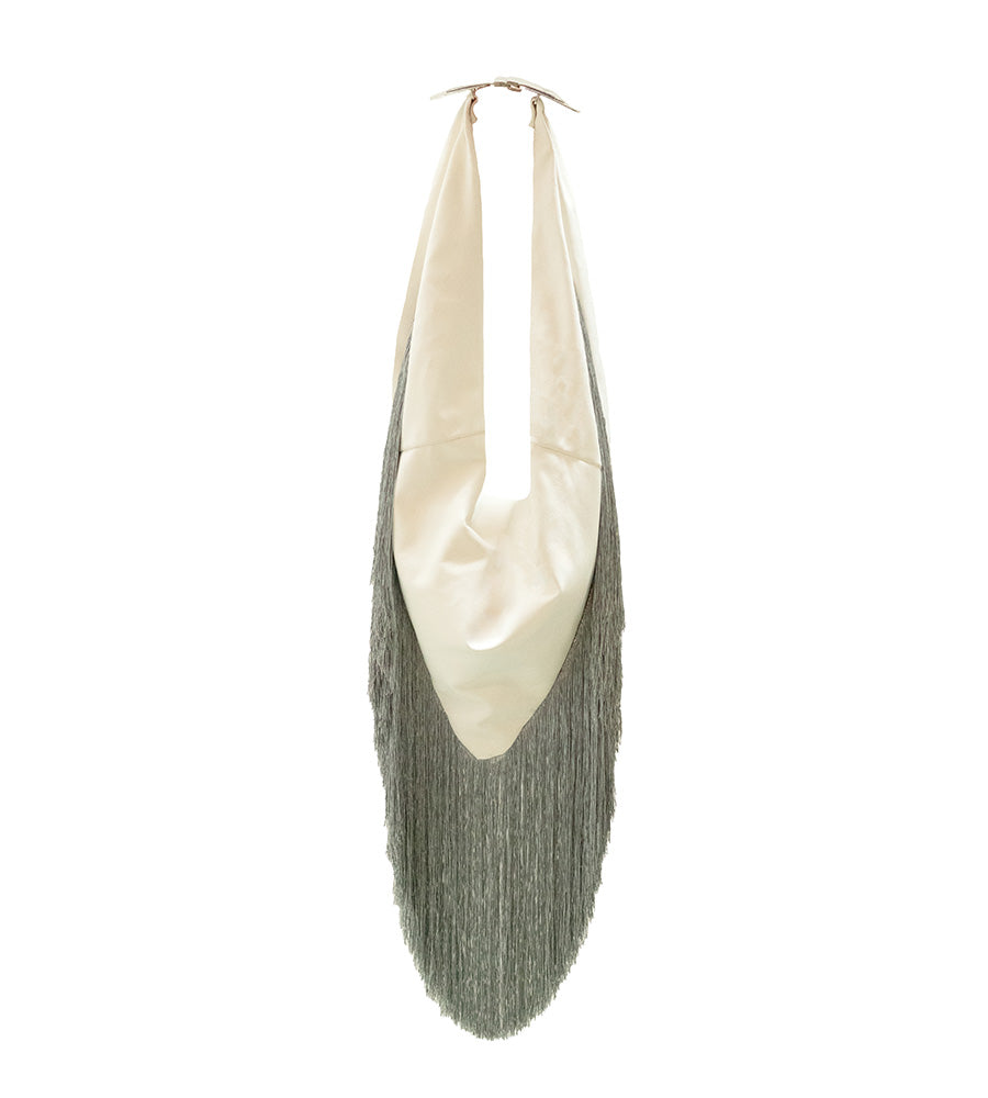 Medium hobo shoulder bag silhouette, luxury deadstock leather body, silver Italian fringe trim detail, vintage metal buckle at shoulder, lined